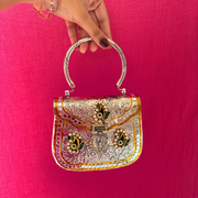 Step into royalty with this dual-tone silver and gold-plated masterpiece, embellished with intricate enamel work and studded with shimmering stones. The structured silhouette is enriched with paisley-inspired motifs, a jeweled clasp lock, and a polished round handle that makes it the ultimate festive showstopper.
