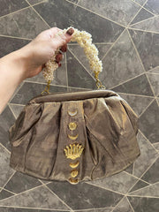 A timeless blend of modern metallic shine and traditional craftsmanship, this silver potli is designed to elevate every festive and wedding look. The soft metallic base is beautifully gathered and finished with gold lotus and crescent motifs, adding a touch of divine grace and regal charm.