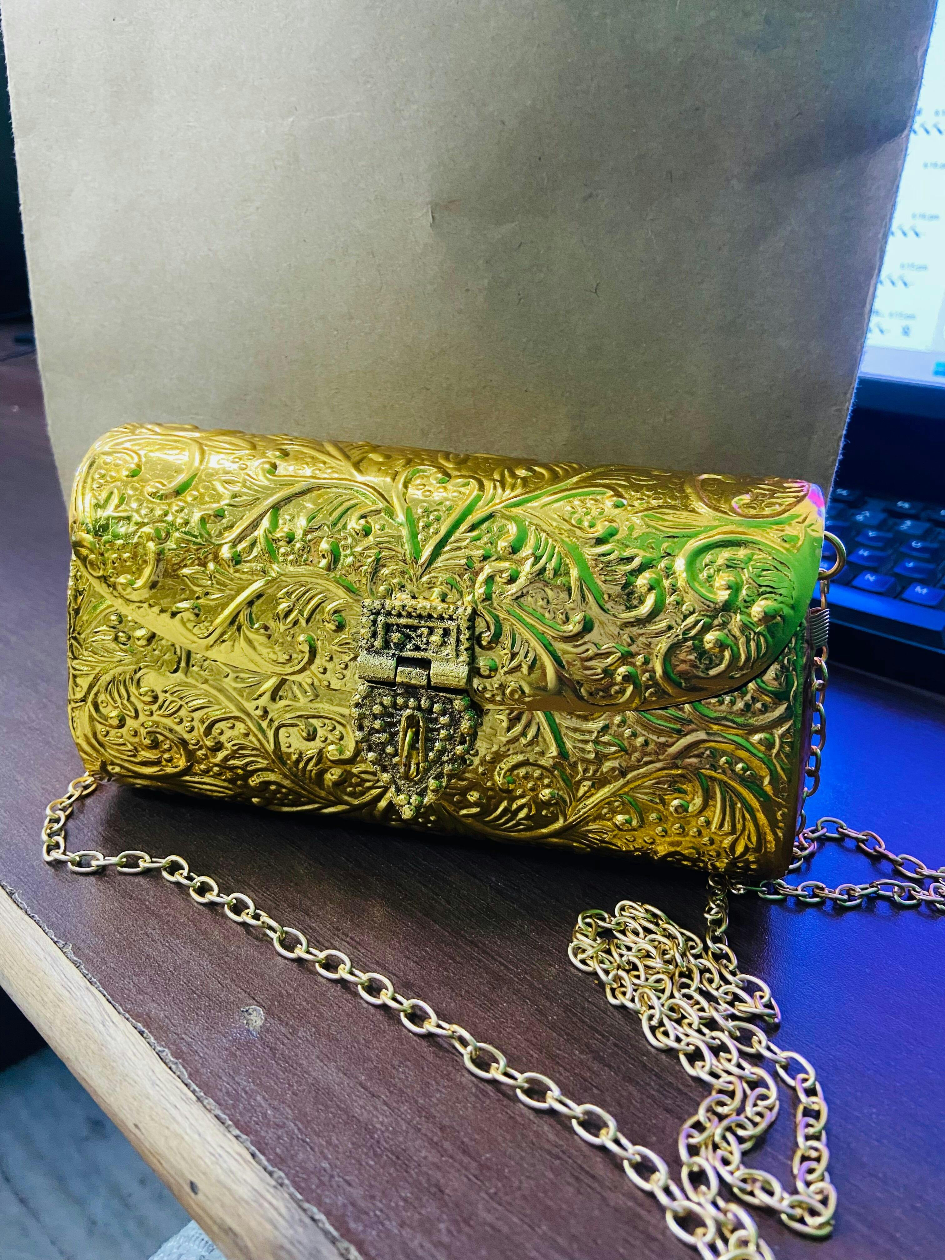 A timeless gold metal bag embossed with vintage floral patterns. Features a front clasp and a subtle sheen that exudes elegance.